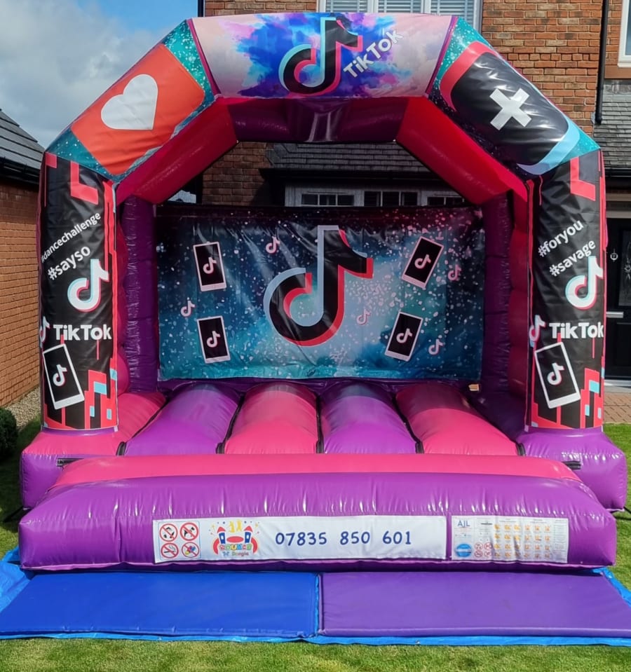 Introducing the TikTok bouncy castle with multiple coloured artwork this Inflatable is popular with all children and is a fantastic choice for any event. You can choose from a Pink/Purple or a Blue castle just let us know your preference when booking.